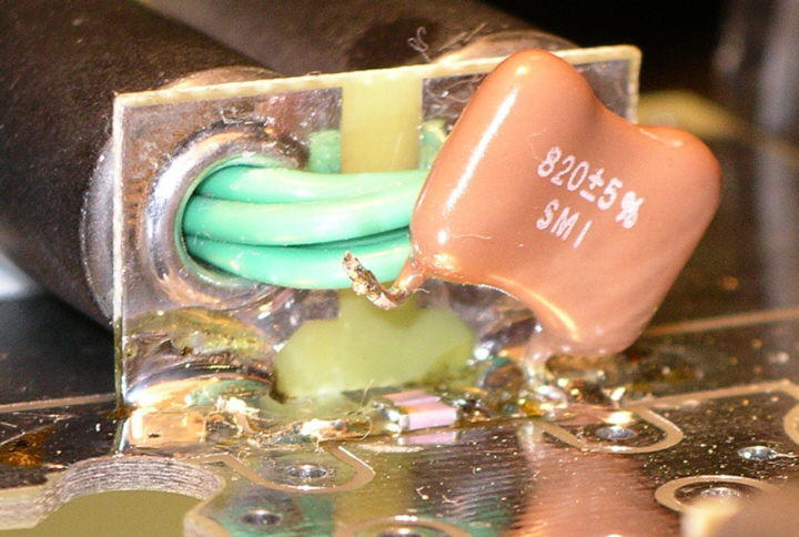 Close up of C6 (surface mount and through hole capacitors) on the CCI amplifier