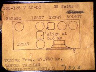 on bottom of radio. Note tuning frequency and strange IF of 3.3 MHz.